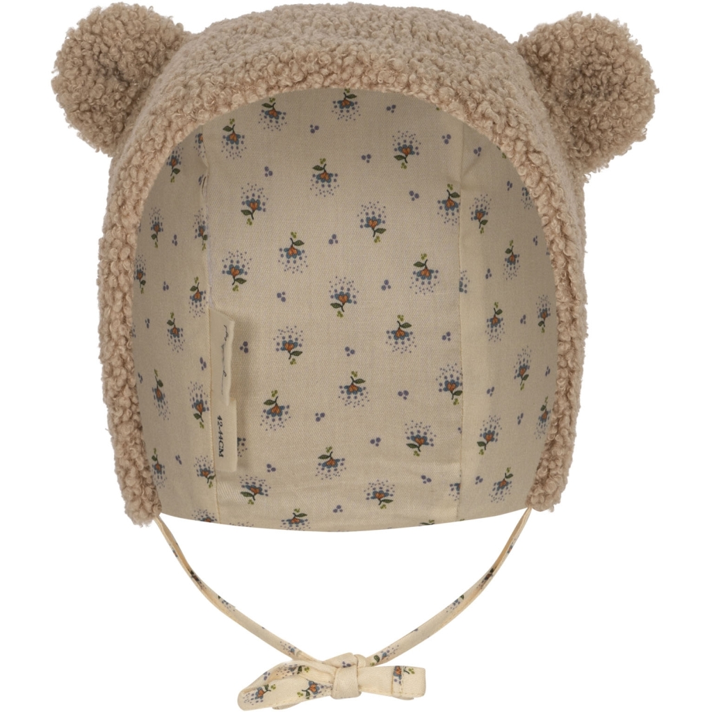 Adorable bonnet souple orné d'oreilles d'ourson et de cordons à nouer sous le menton.