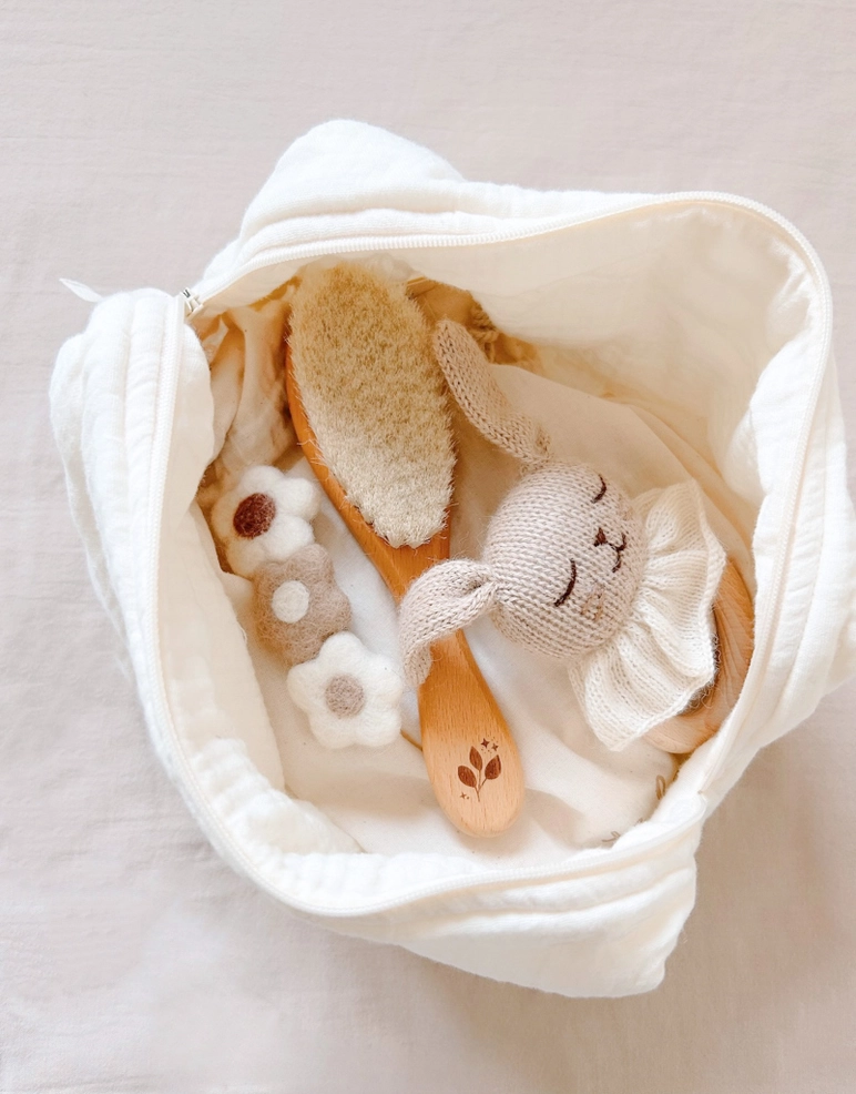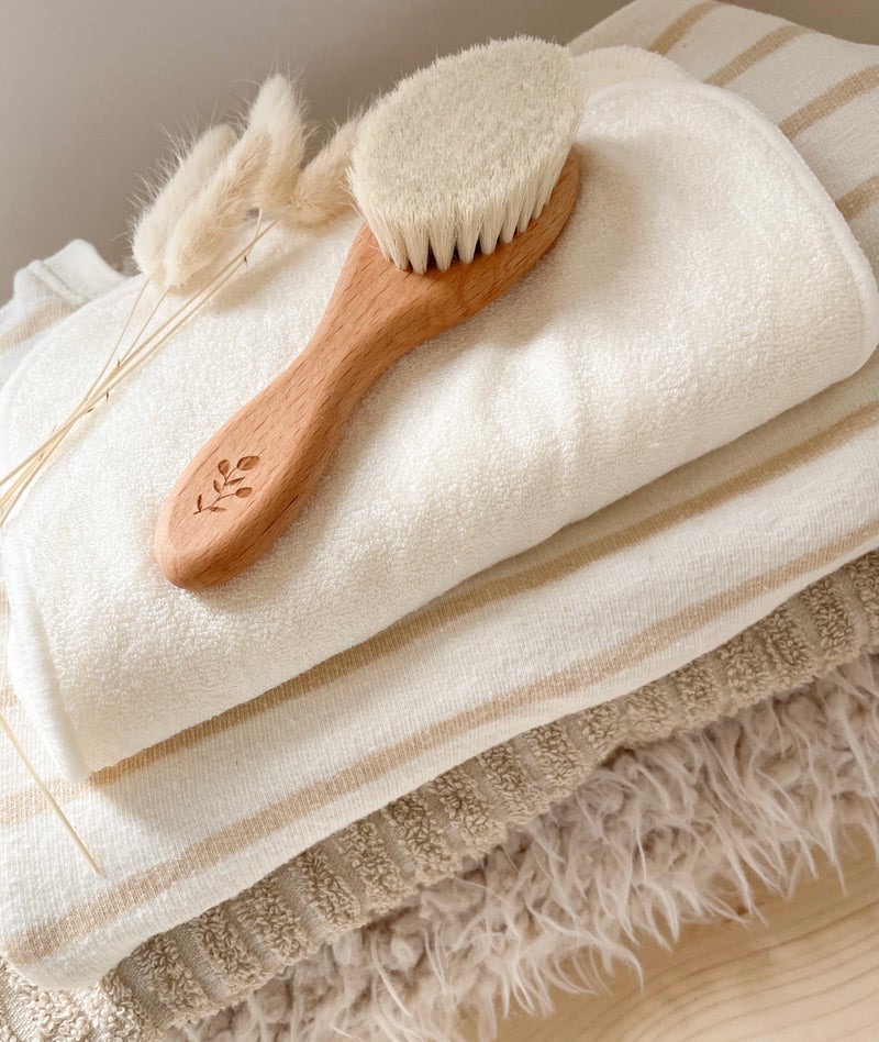 Offrez à votre bébé le meilleur soin capillaire avec notre brosse à cheveux en bois de hêtre et poils de chèvre. Douce et naturelle, elle est spécialement conçue pour coiffer en douceur les cheveux fins des tout-petits. Idéale comme cadeau de naissance, elle est accompagnée d'un pochon en coton bio, pratique pour ranger les accessoires de bébé.