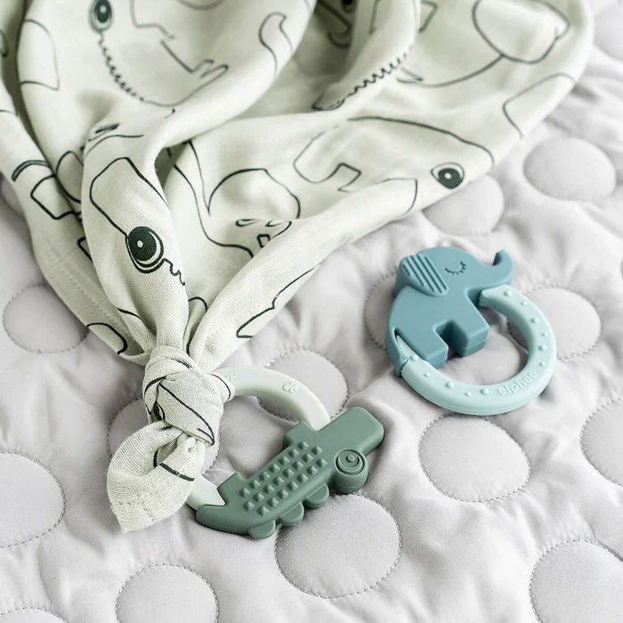 Cet ensemble d'anneaux de dentition est idéal pour les tout-petits, stimulant leurs sens visuels, oraux et tactiles. Avec leurs teintes douces de bleu et de vert, leurs textures amusantes et leurs designs mignons, Croco et Elphee deviendront rapidement les jouets préférés de votre bébé.
